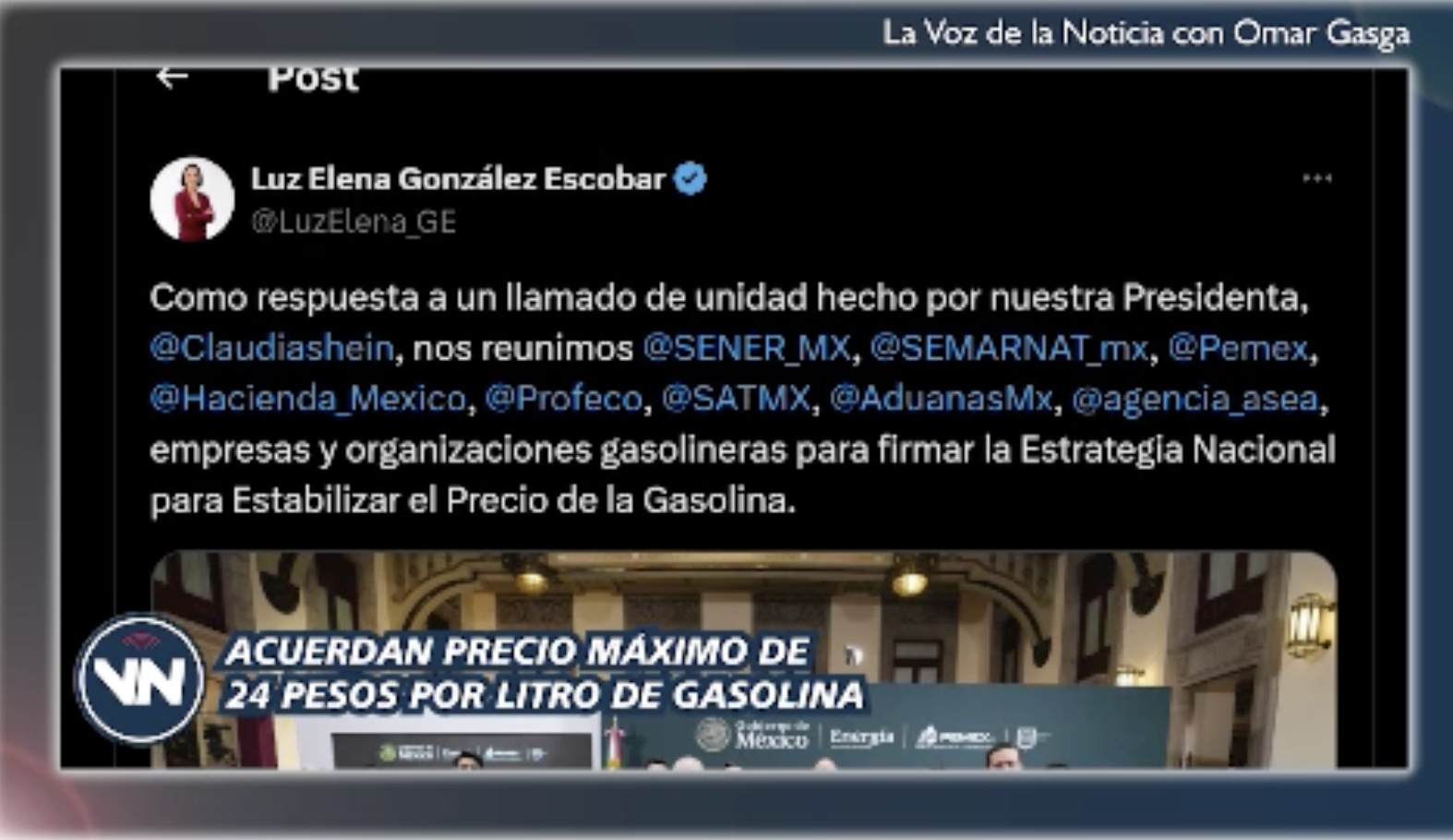 La titular de la Secretaría de Energía, Luz Elena González Escobar, compartió en redes sociales imágenes de la firma de este acuerdo, suscrito con las secretarías de Hacienda, Medio Ambiente y Recursos Naturales, además de la Procuraduría Federal del Consumidor, el Servicio de Administración Tributaria y empresarios del sector gasolinero, con la presencia como testigo de honor de la presidenta Claudia Sheinbaum.