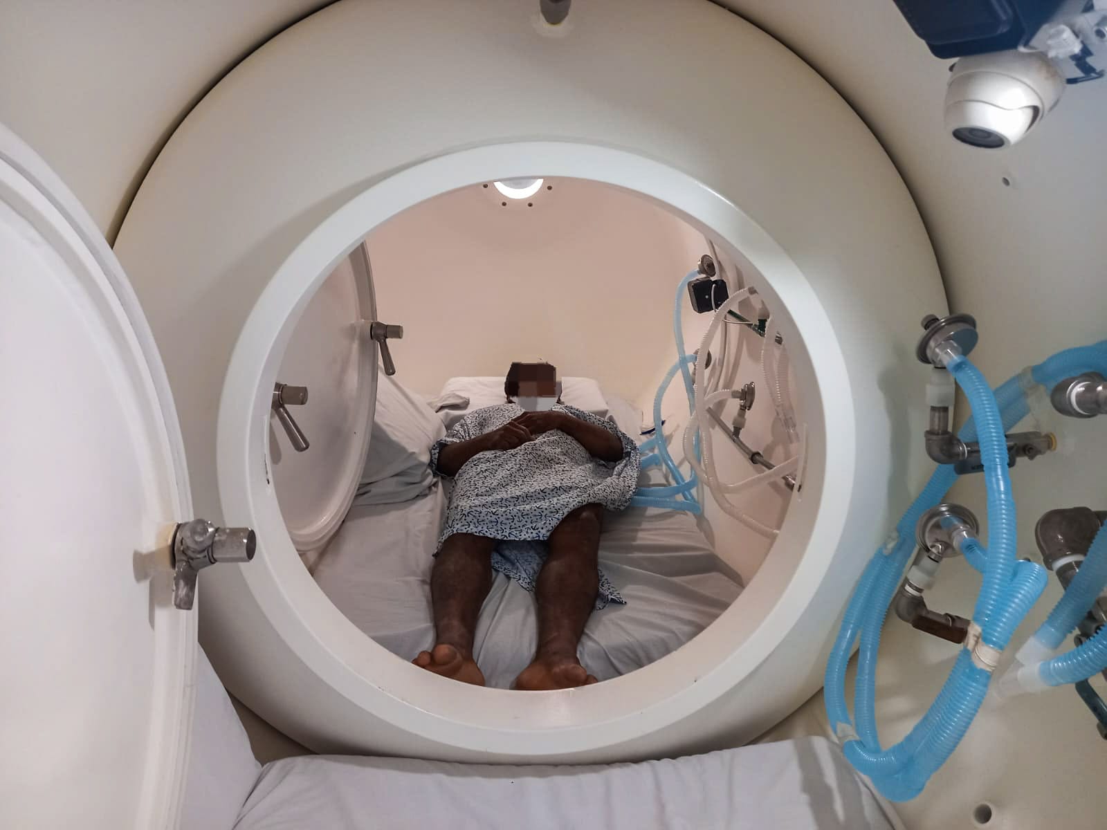 Con esta cámara hiperbárica con la que cuenta el hospital naval de Huatulco se le aplicó el proceso terapéutico con el que se garantizó una atención completa y efectiva al encargarse de la liberación de nitrógeno en el cuerpo, que no se completa en un ascenso rápido, para eliminar los síntomas de la descompresión.
