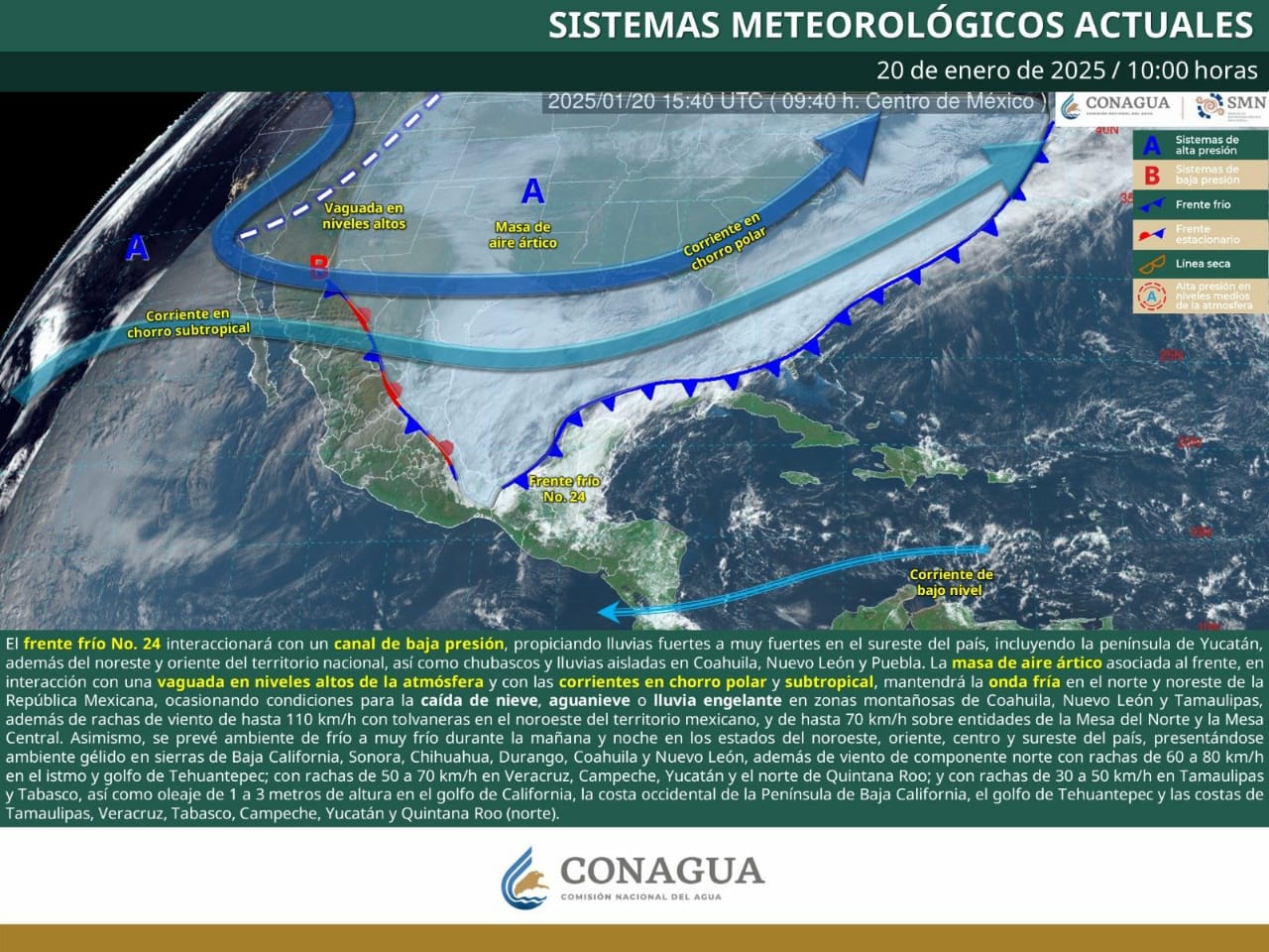Esta tarde el frente frío número 24 se extiende desde el interior de la República Mexicana hasta Florida, Estados Unidos, informó la Coordinación Estatal de Protección Civil de Oaxaca.