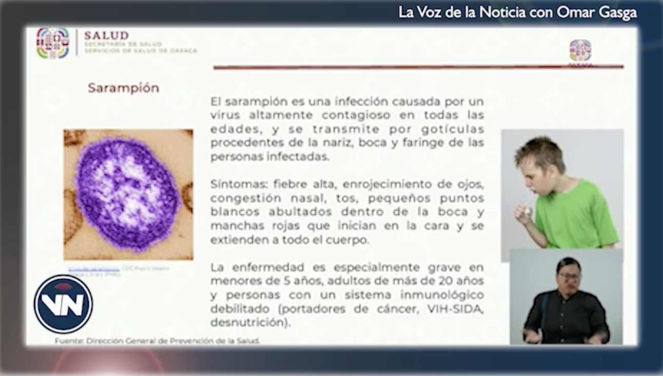 El funcionario explicó que el sarampión es una infección causada por un virus del género morbillivirus de la familia Paramyxoviridae, manifestándose preferentemente en la etapa infantil con síntomas como: fiebre alta, enrojecimiento de ojos, congestión nasal, pequeños puntos blancos abultados dentro de la boca (manchas de Kóplic) y manchas rojas que inician en la cara y se extienden en todo el cuerpo.